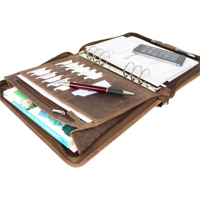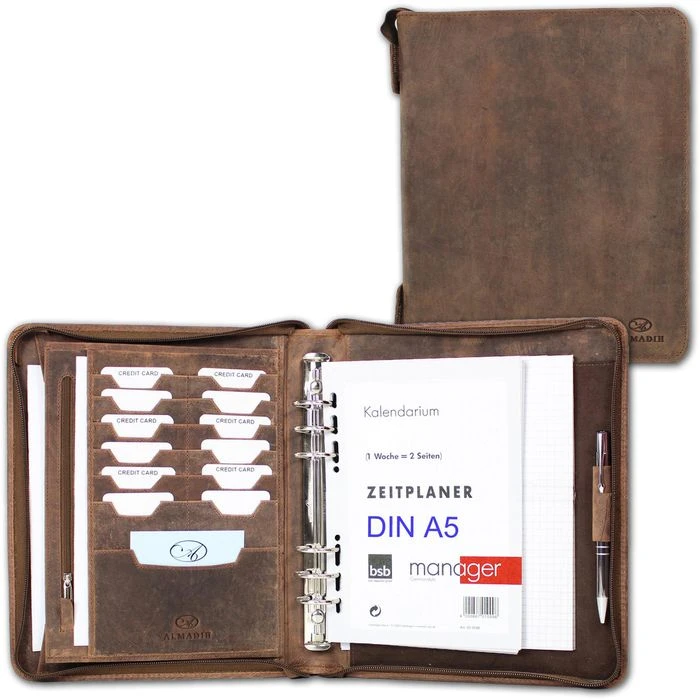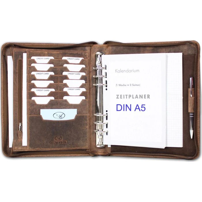 sonstiges: mit Stiftehalter, zahlreichen Einsteckfächern für Visitenkarten und Einschubfächern für lose Blattsammlungen, einem Reißverschlussfach, Papierblockfach sowie einem breitem Steckfach für Bücher, individuell einstellbare Spannung des Reißverschlusses durch Klettverschlüsse an den Enden