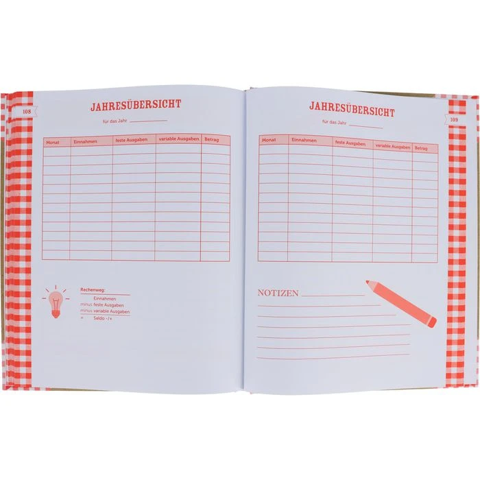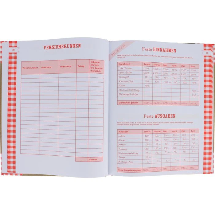 sonstiges: Bestandsaufnahme (mit Kontoübersicht, Einzugsermächtigungen, Daueraufträgen und Versicherungen), Musterbeispiele zu festen und variablen Einnahmen und Ausgaben, Jahresübersicht, Seiten für Notizen, Hinweise