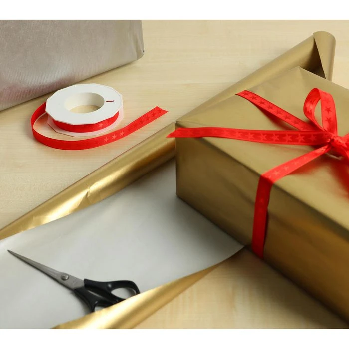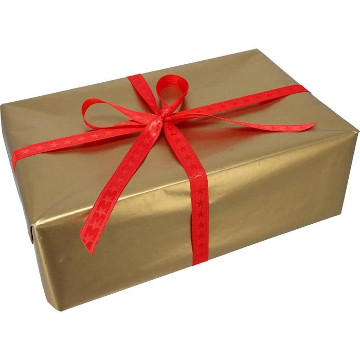 • Rotes, 1,5cm breites Schleifenband mit Stern-Dekor und Webkante