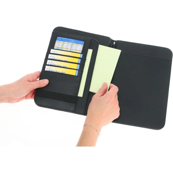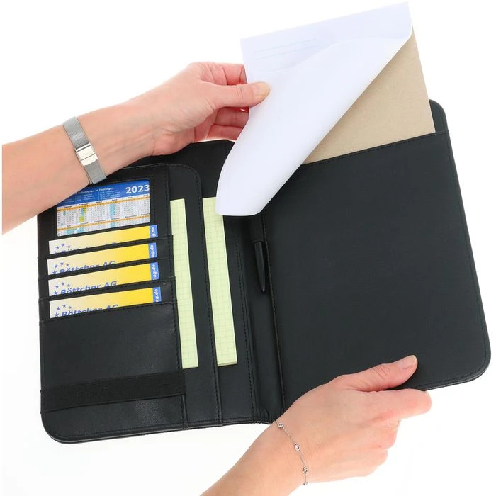 sonstiges: Visitenkartenfach, Steckfach für einen Schreibblock, 2 große Einsteckfächer, große Gummizugschlaufe für einen Taschenrechner oder ähnliches